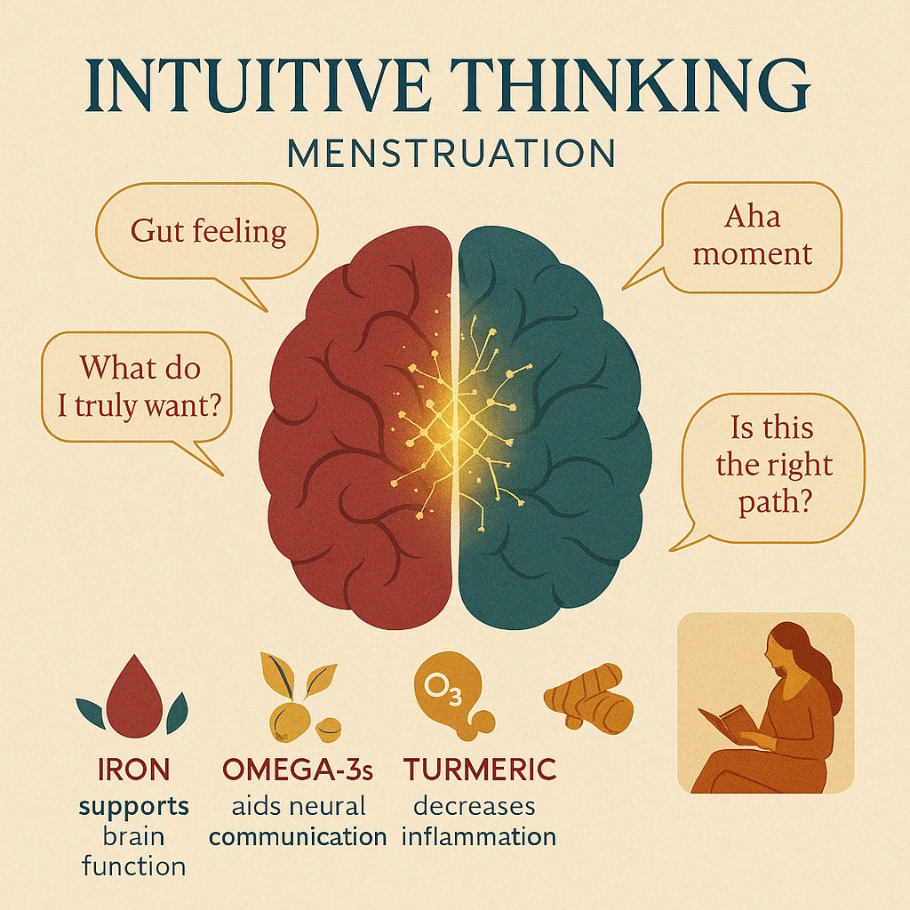 Caption: During menstruation, communication between your brain hemispheres increases, enhancing intuitive capabilities that can be further supported with anti-inflammatory nutrients.